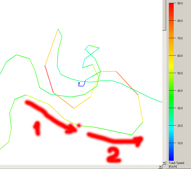 Смотрим GPS трек. Отрезок 1 - непосредственно перед отказом двигателя, видно что скорость там больше 50, скорее 60км/ч.