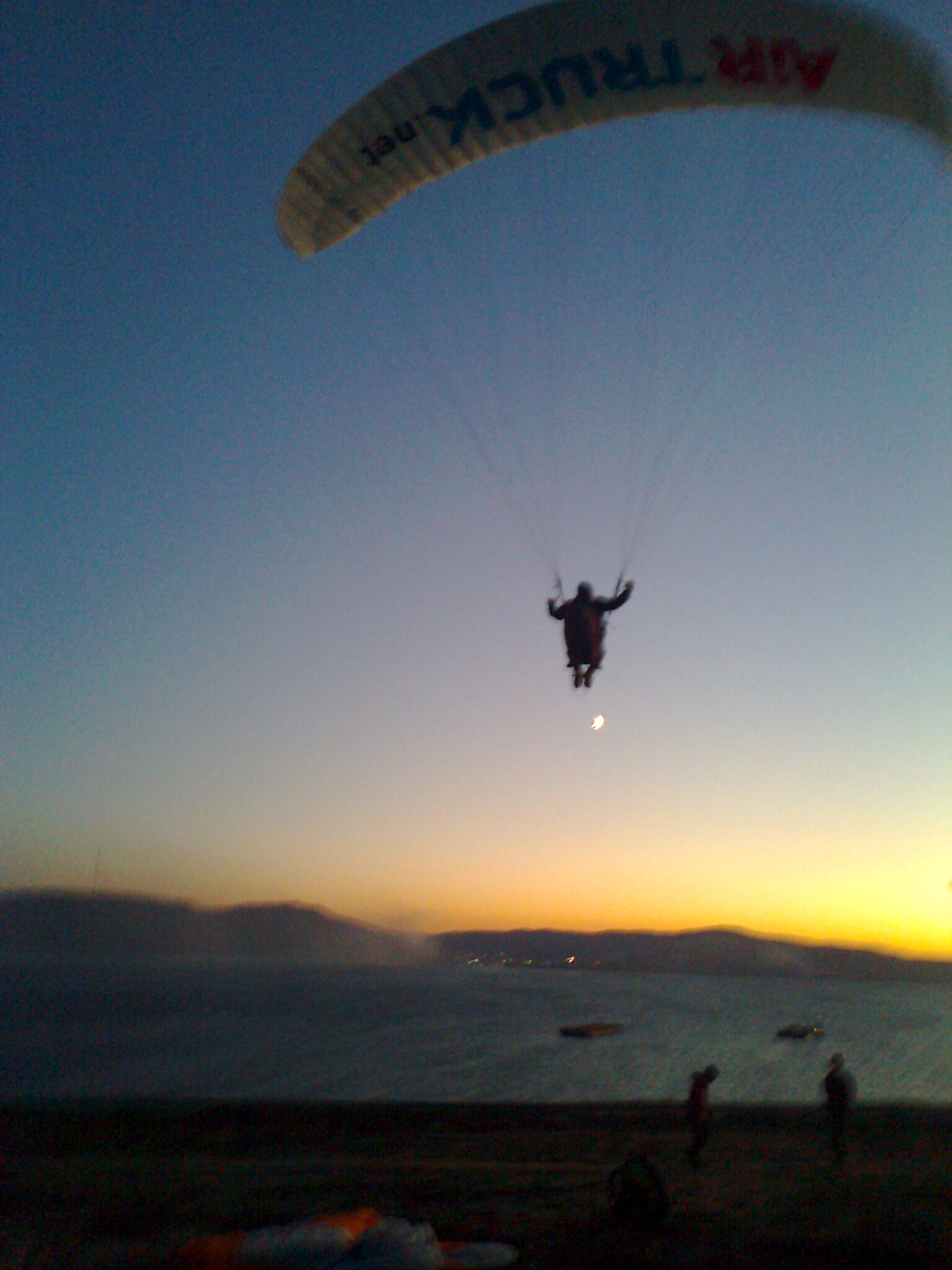 С большим трудом Макс снизился, поднимало даже на ушах, и совершил очень динамичную посадку на склон по ветру. Взбивая клубы пыли, его протащило метров 6 вверх по склону. В результате посадки склон и подвеска немного пострадали.