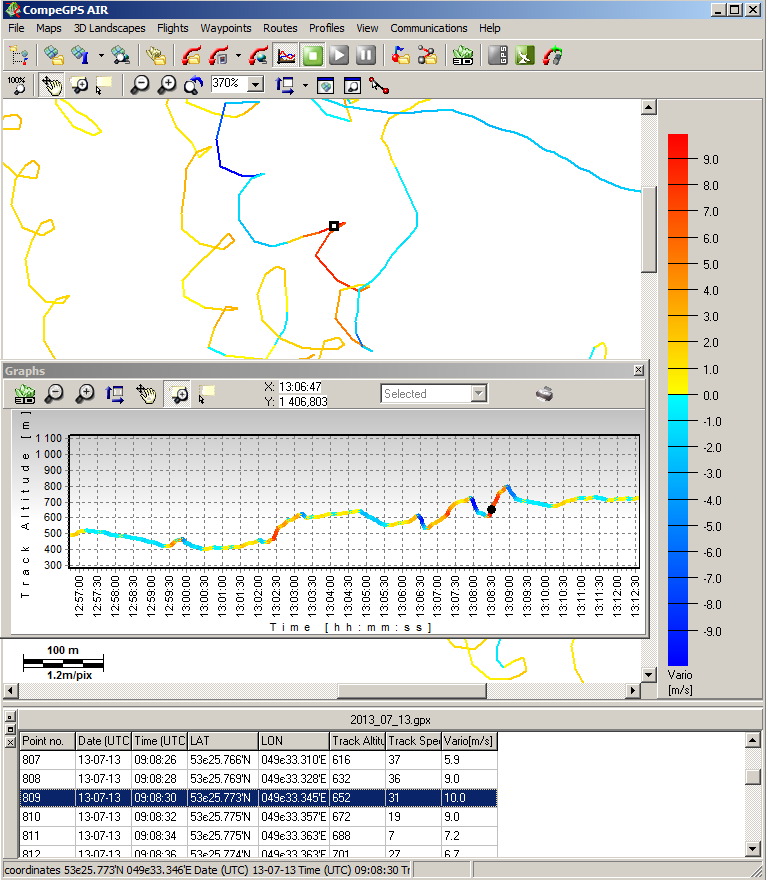 CompeGPS показывает заброс +10.0 м/с при проходе через ядрышко термика!