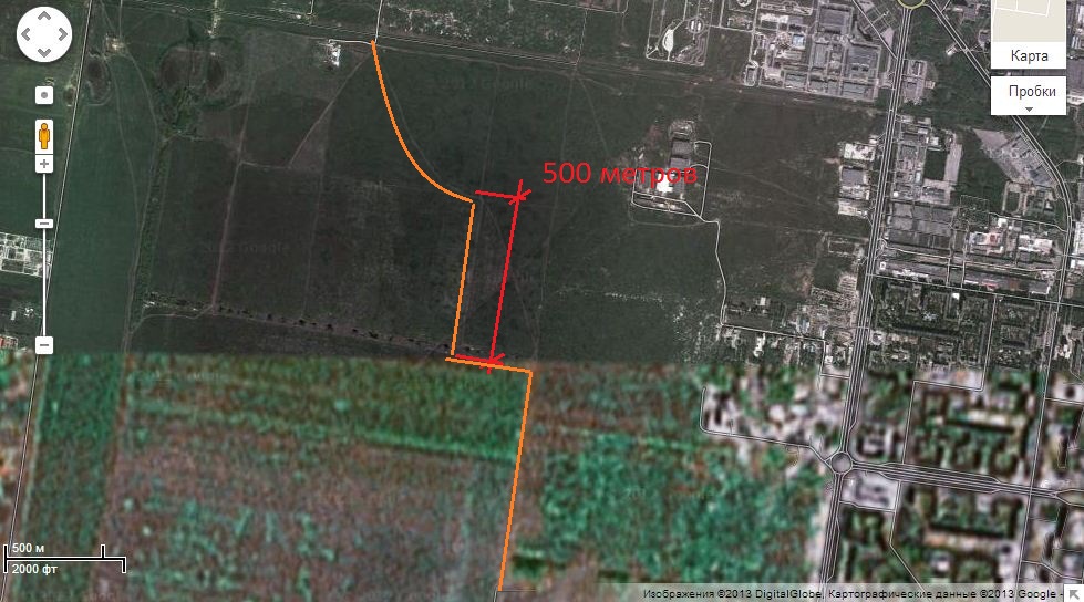 Проехался через поле между Подстепками и заводом, отметил маршрут оранжевой линией.